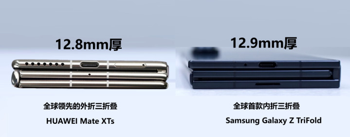反观华为的三折叠设计,走的是“Z字形”外折和内折混合路线,折叠后就是三层堆叠。虽然厚度也来到了 12.8 mm,但从视觉效果上来看,差距还是很明显的。
